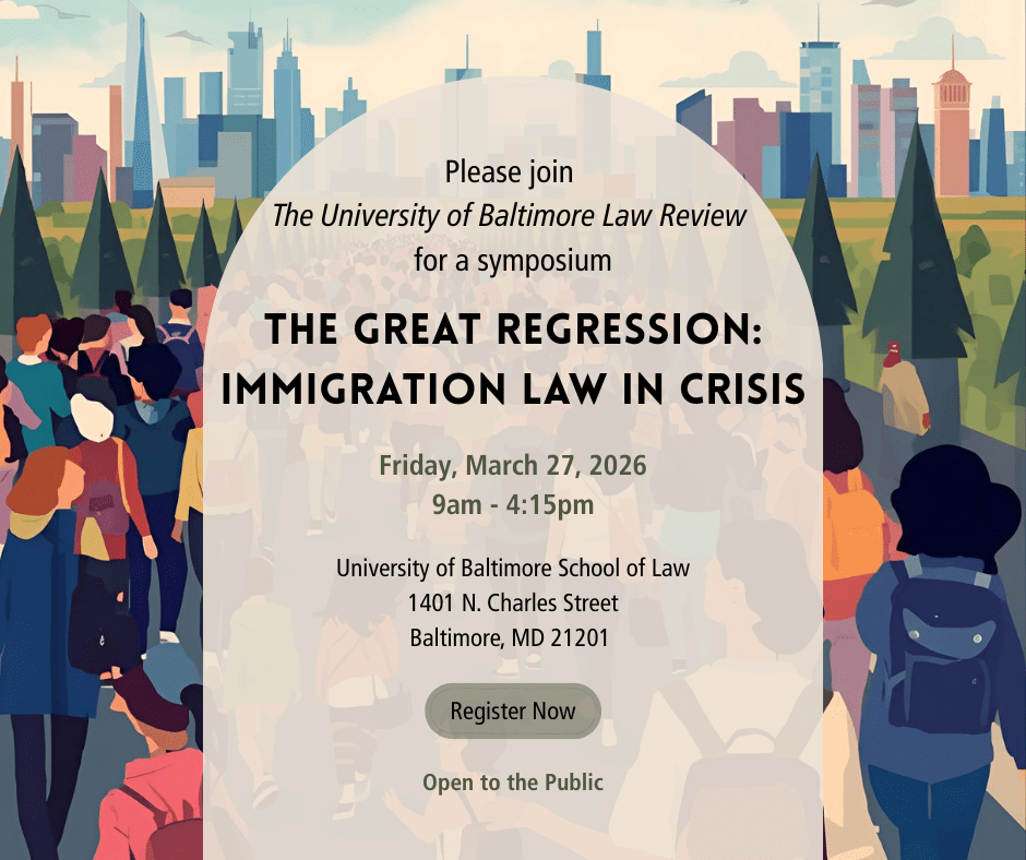 Summary: The University of Baltimore Law Review invites you to our annual Spring symposium. This year, we are addressing the second Trump Administration’s unprecedented immigration policy changes, as well as legal challenges to those policies. The Symposium will consist of three panels of experts from across the country, and will consider novel frontiers in immigration enforcement, mass deportation, struggles over citizenship , and calls to restore the legal guardrails in the immigration law enforcement system all with the goal of fostering a lively discussion about the ongoing battle to maintain immigration rights within the United States of America. The event will take place on Friday, March 27, 2026, and is open to the public. Register here.